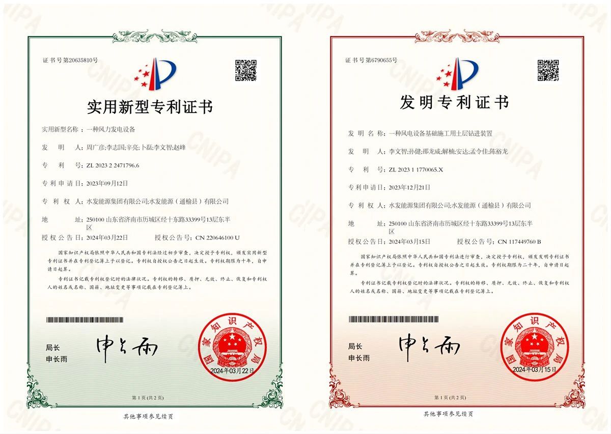 喜報!水發能源通榆公司實用新型專利加一、發明專利再加一